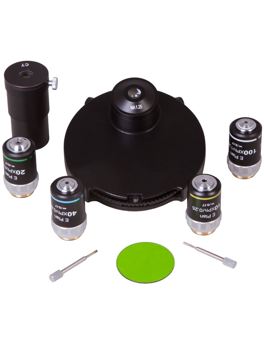 El kit incluye todos los elementos necesarios para realizar observaciones mediante el método de contraste de fases. Los objetivos estándar del microscopio se cambian por objetivos especiales de fase y a continuación hay que corregir la óptica con un microscopio auxiliar. Se instala un condensador de fase en lugar del preinstalado. Presenta dos modos de trabajo: contraste de fases o campo claro.