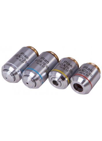 Este juego incluye cuatro objetivos con aumentos de 4x, 10x, 40x, 100xs. Puede usar estos objetivos para observaciones clásicas «secas»; asimismo, el objetivo 100x permite observaciones con inmersión en aceite. Los modelos 40x y 100x son retráctiles. Se requiere un cubreobjetos de 0,17 mm para las observaciones.