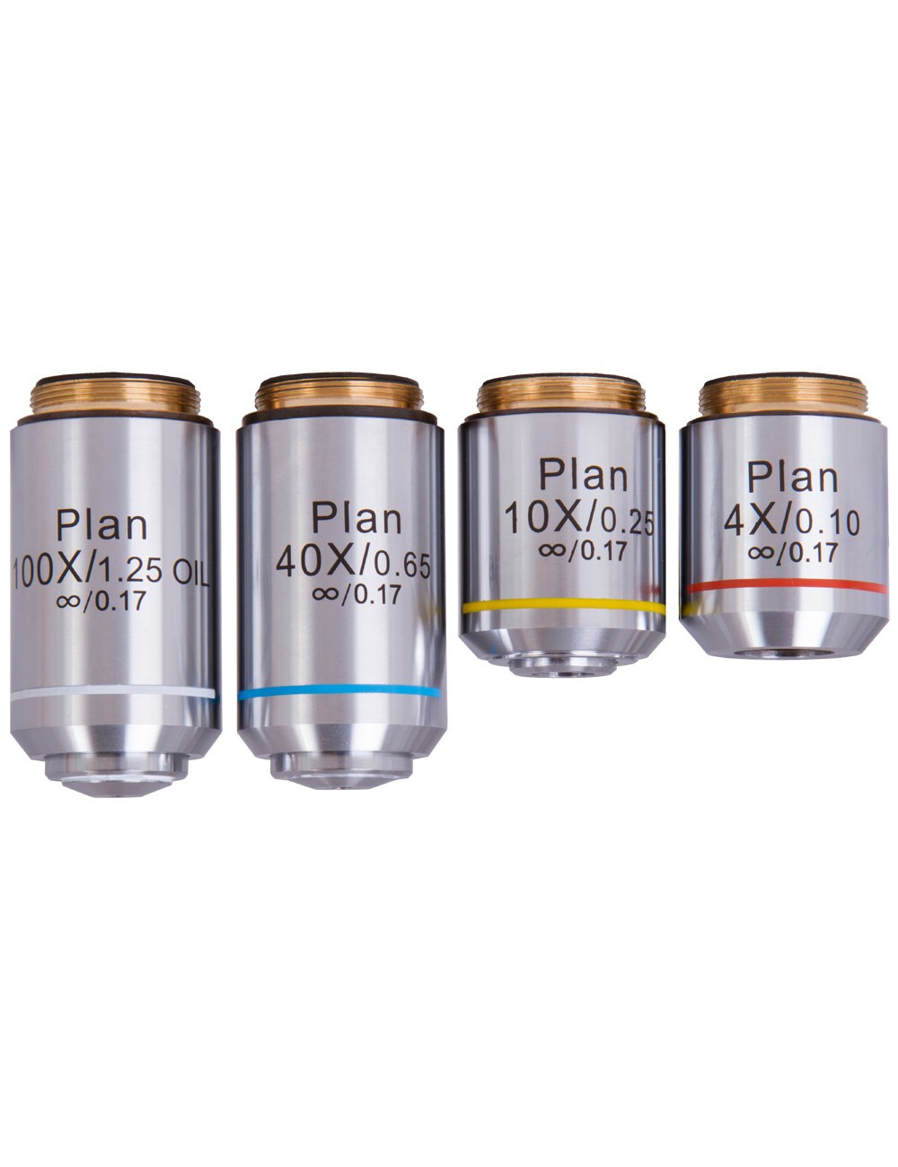Juego de objetivos Plan Levenhuk 1000, con aumentos de 4x, 10x, 40xs, 100xs (aceite)