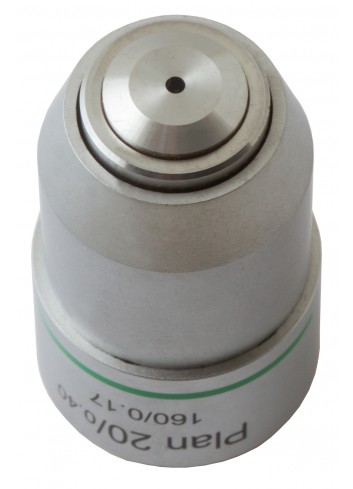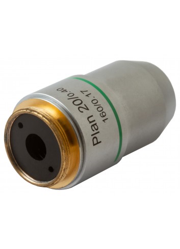 El objetivo Levenhuk MED 20x es un objetivo plano acromático. Su óptica elimina las aberraciones esféricas y aplana significativamente el campo de visión. El usuario obtiene una imagen nítida, detallada y clara incluso al observar microestructuras complejas. Las lentes de vidrio proporcionan un aumento de 20x. El cuerpo está hecho de metal.