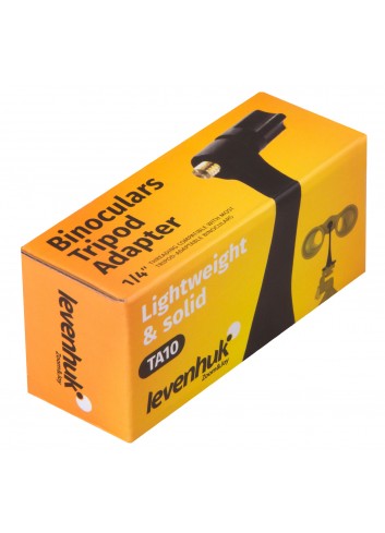 El adaptador tiene un vástago roscado de 1/4" en la parte superior y un orificio roscado de 1/4" en la parte inferior. El adaptador Levenhuk TA10 es compatible con la mayoría de binoculares y trípodes de varios fabricantes.