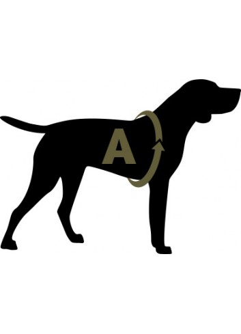 Para elegir la talla del chaleco, mida el contorno A de su perro, según se muestra en la imagen, correspondiente a la parte más ancha de la caja torácica. La longitud en centímetros de la circunferencia de pecho A corresponde a la talla.