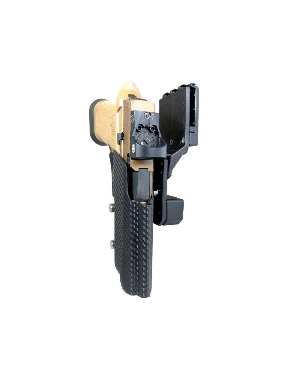 La funda profesional de competición Heavy Duty se puede ajustar en ángulo, altura y retención siendo legal para las divisiones 3GUN, IPSC, y USPSA. La funda acepta cinturones de 1.5''a 1.75'' retirando la tapa con una llave allen.