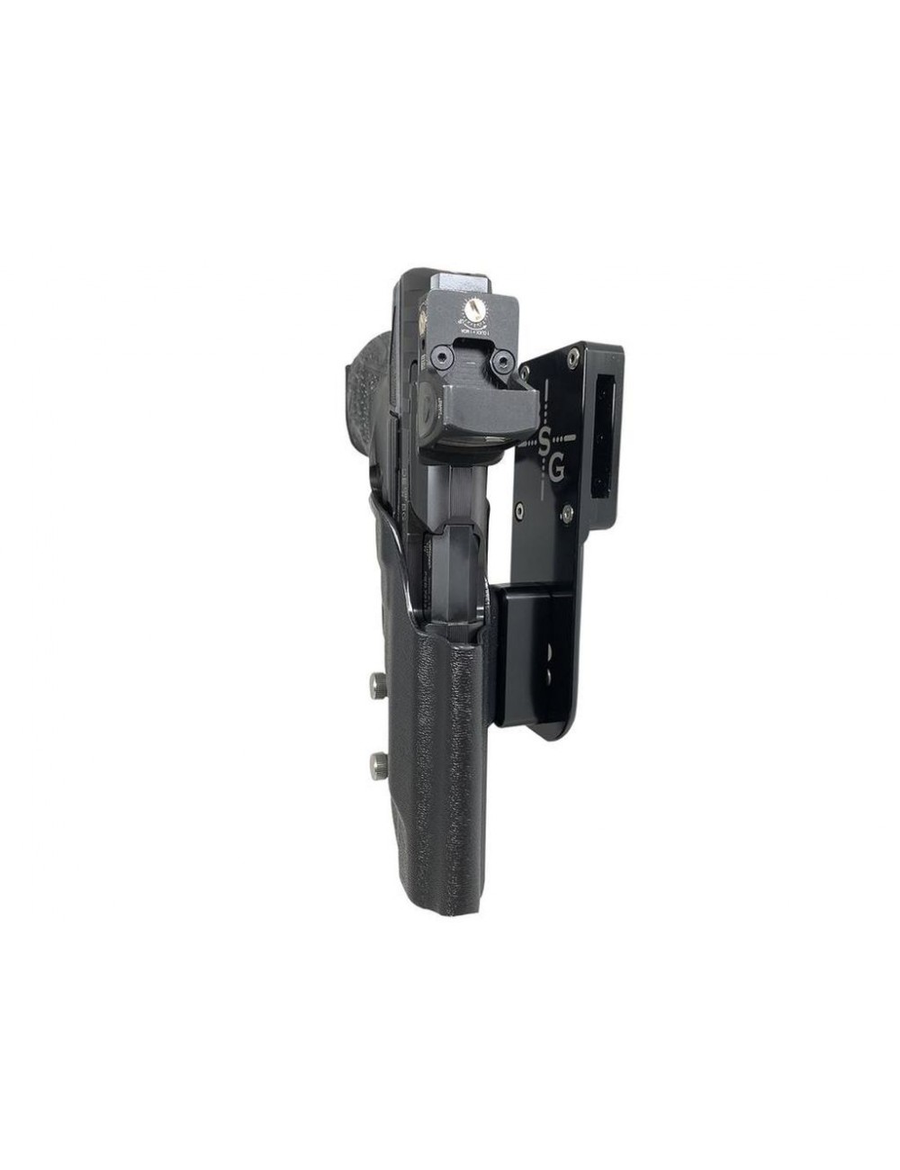 La funda profesional de competición Heavy Duty se puede ajustar en ángulo, altura y retención siendo legal para las divisiones 3GUN, IPSC, y USPSA. La funda acepta cinturones de 1.5''a 1.75'' retirando la tapa con una llave allen.
