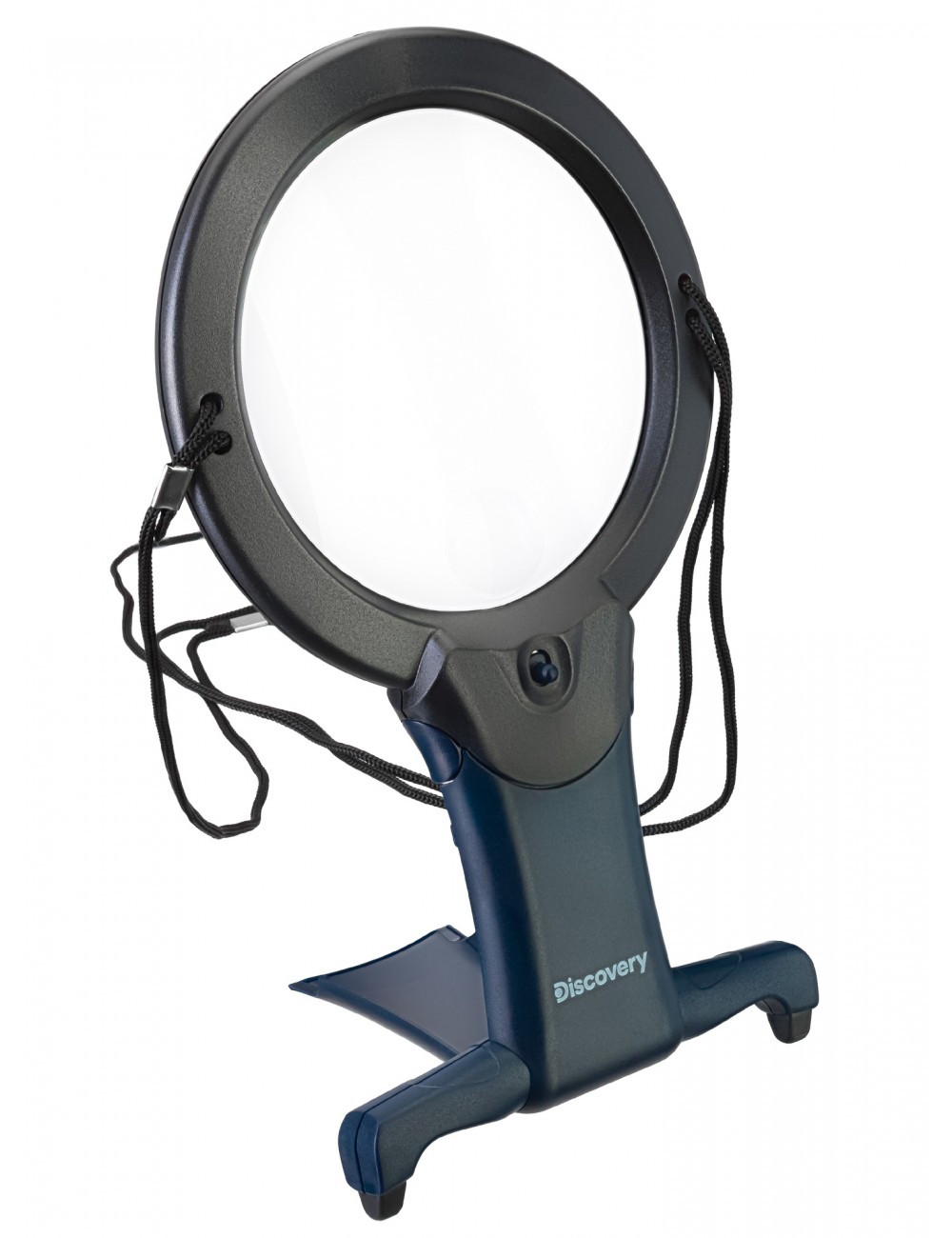 La lupa se puede colocar sobre una mesa mediante un soporte o colgarse del cuello con un cordón. Hay iluminación LED integrada para condiciones de poca luz. Los diodos LED funcionan con pilas.