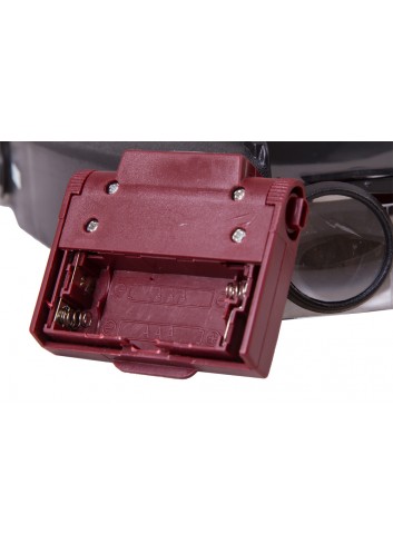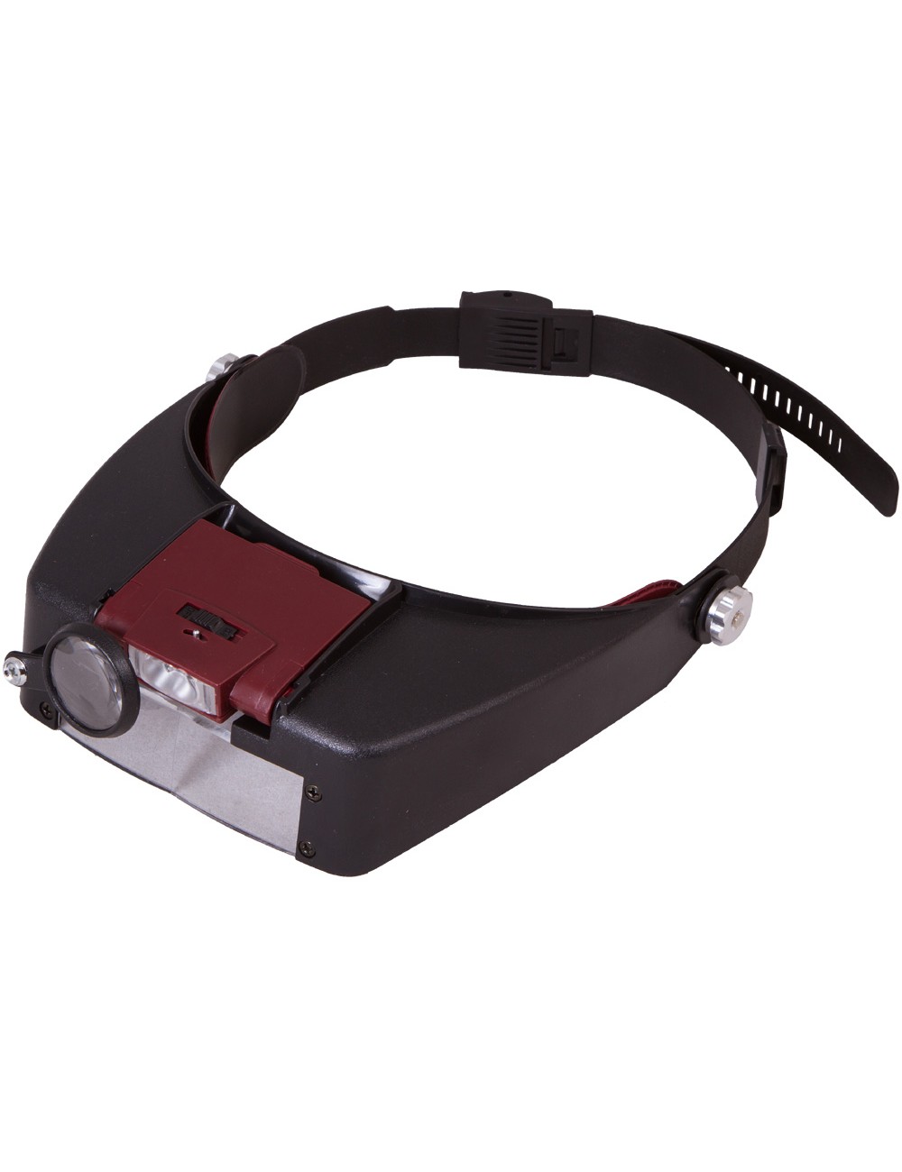 La lupa frontal Levenhuk Zeno Vizor H2 se sujeta a la cabeza utilizando una cinta especial de longitud ajustable. La lupa está equipada con luces LED para iluminar la zona de trabajo. Puede encenderla y apagarla cuando quiera utilizando el interruptor de la lupa.