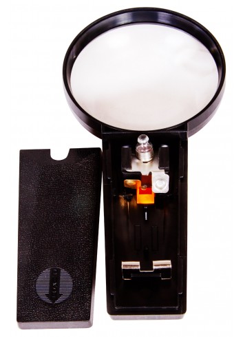 La lupa tiene una lente bifocal. La lente está hecha de plástico óptico; proporciona una imagen clara y detallada. No hay aberraciones ni puntos borrosos. El marco y el mango están hechos de plástico. La lupa cuenta con una luz, cuyo interruptor está situado en el mango. La luz se alimenta con pilas (adquiribles por separado).