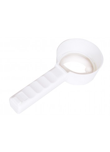 La lupa tiene una lente bifocal. La lente está hecha de plástico óptico; proporciona una imagen clara y detallada. No hay aberraciones ni puntos borrosos. El marco y el mango están hechos de plástico. La lupa cuenta con una luz, cuyo interruptor está situado en el mango. La luz se alimenta con pilas (adquiribles por separado).