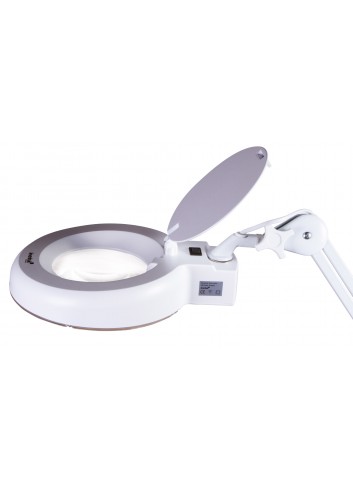La lente tiene un marco resistente y está protegida contra el polvo por una cubierta de bisagra. Protege la óptica contra el polvo cuando se guarda la lupa. La lámpara está situada junto a la lente. La potencia de la lámpara le permite trabajar incluso en una habitación oscura. La lámpara se alimenta con una fuente de alimentación CA.