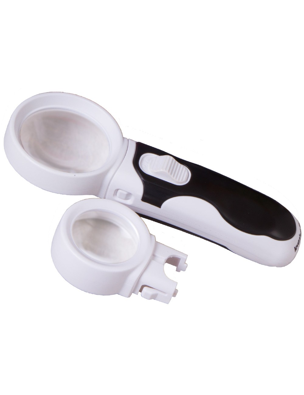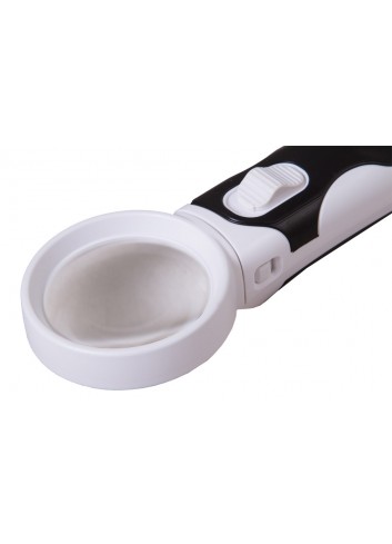 El mango ergonómico de la lupa permite instalar dos lentes intercambiables, de factor de ampliación y diámetro diferentes, mediante una simple hebilla. Utilice el factor de ampliación alto para el estudio de objetos pequeños o el factor de ampliación bajo para la lectura. La iluminación por LED está integrada en el mango; proporciona una iluminación uniforme de la superficie de trabajo completa cubierta por la lente.