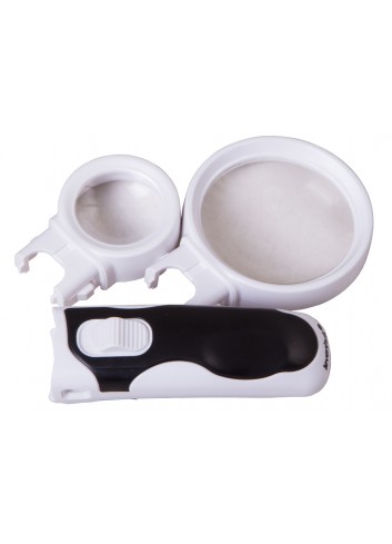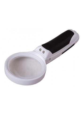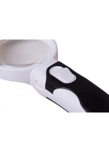 El mango ergonómico de la lupa permite instalar dos lentes intercambiables, de factor de ampliación y diámetro diferentes, mediante una simple hebilla. Utilice el factor de ampliación alto para el estudio de objetos pequeños o el factor de ampliación bajo para la lectura. La iluminación por LED está integrada en el mango; proporciona una iluminación uniforme de la superficie de trabajo completa cubierta por la lente.