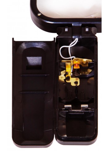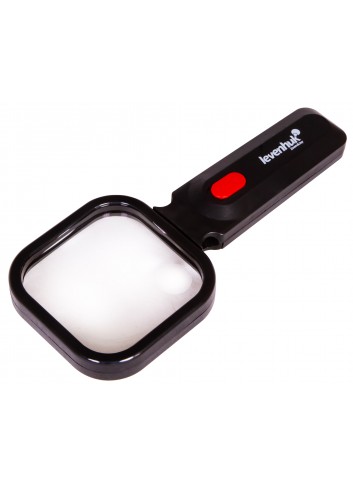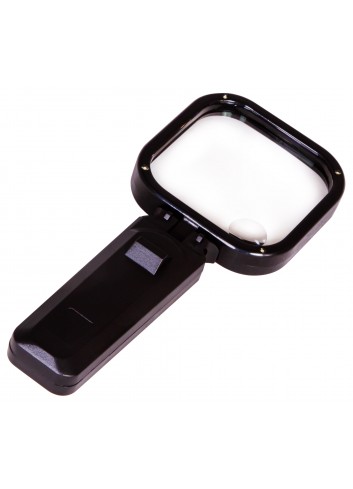 Todos los elementos ópticos de esta lupa están hechos de plástico. La lupa es ligera para sostenerla en la mano. La lente proporciona una imagen nítida, sin borrosidades ni aberraciones. Dispone de un ángulo de inclinación variable. Existe una lámpara LED junto a la lente. El brillo se ajusta con un interruptor existente en el cuerpo de la lupa. La lámpara funciona con pilas (no incluidas).
