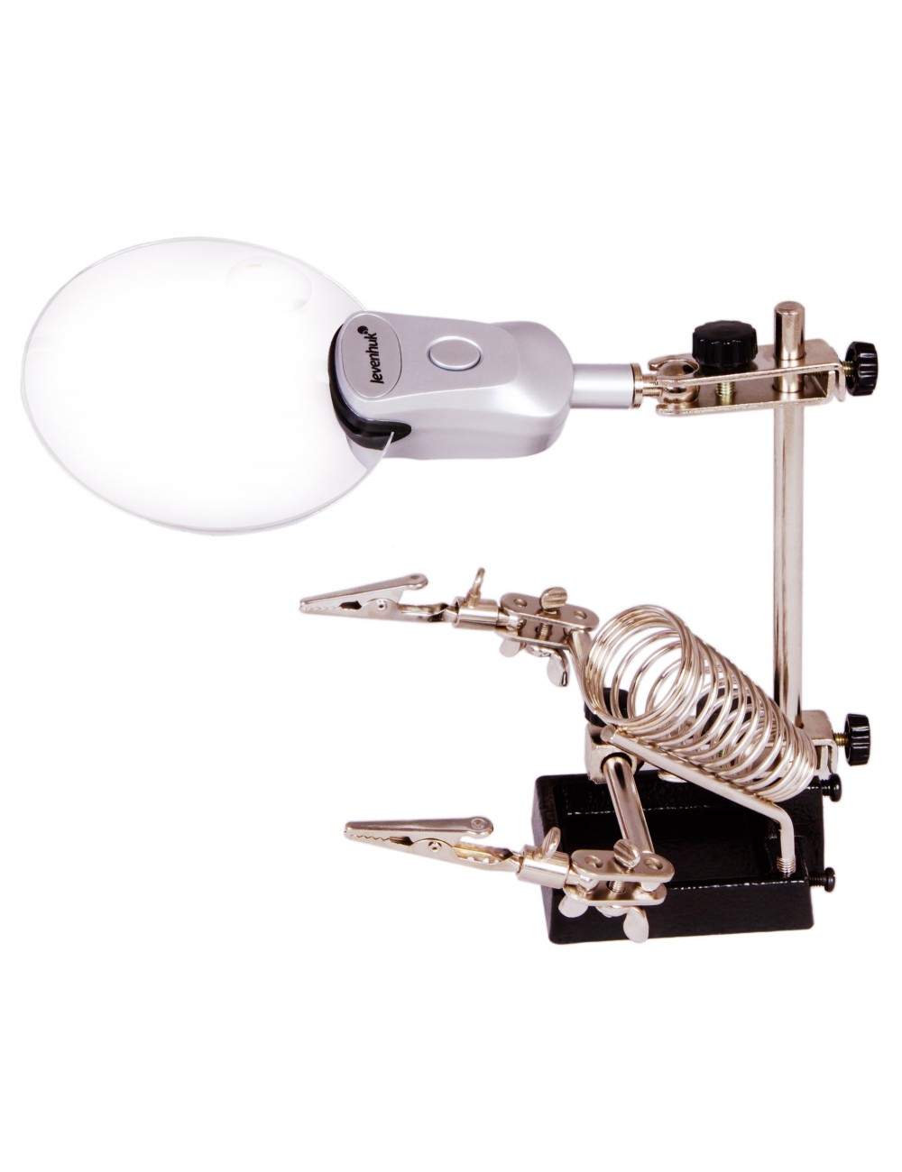 La lente está hecha de plástico óptico y proporciona una imagen clara y detallada de un objeto ampliado. Su cuerpo de metal duradero garantiza un soporte estable y una larga vida útil. Todas las lupas de esta serie tienen soportes para trabajos con manos libres que fijan objetos de forma segura.