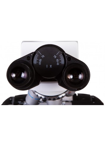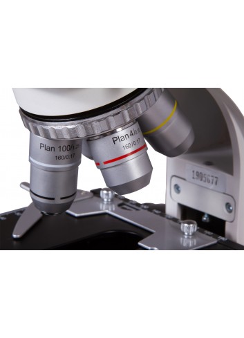 El cabezal trinocular se puede girar 360°. La parte vertical tiene una inclinación de 30°, lo que permite realizar observaciones prolongadas con comodidad. El kit incluye oculares de campo de visión amplio con una ampliación de 10x. Tienen ajuste de dioptrías para adaptar la óptica a la visión de cada individuo. El revólver giratorio contiene cuatro objetivos plano acromáticos, que proporcionan imágenes libres de aberraciones. El objetivo de 100x permite realizar observaciones por inmersión en aceite. Dos de los objetivos utilizan carcasas retráctiles protectoras. La óptica de todos los accesorios tiene un revestimiento antifúngico.