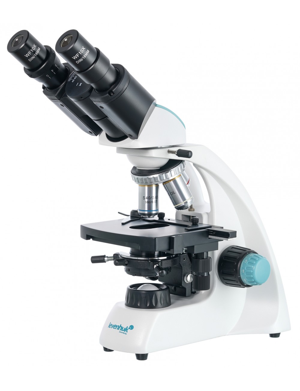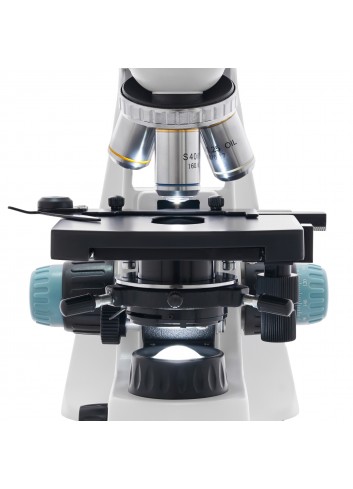 El cabezal binocular es ideal para realizar trabajos prolongados con un microscopio, pues reduce la fatiga visual. El cabezal se puede girar 360° alrededor de su eje y está inclinado a 30°. Los oculares de campo amplio de este microscopio proporcionan un aumento de 10x. Los objetivos acromáticos vienen preinstalados en un revólver giratorio; proporcionan un aumento de 4x, 10x, 40x y 100x. El aumento total del microscopio varía desde 40x a 1000x. Los objetivos de 40x y 100xs están equipados con un mecanismo de retracción por muelle que protege la lente delantera. El objetivo de 100xs se puede utilizar para la inmersión en aceite.