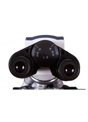 Los oculares y los objetivos están hechos de vidrio óptico y tienen un revestimiento antifúngico. Los oculares proporcionan un aumento de 10x y un amplio campo de visión que permite trabajar con muestras extensas. El microscopio tiene instaladas lentes objetivo acromáticas. El grado de ampliación se cambia girando un revólver giratorio. La lente de 100x se puede utilizar para realizar observaciones por inmersión en aceite (se incluye un tubo de aceite de inmersión en el kit). Las lentes objetivo de mayor aumento tienen un borde retráctil.