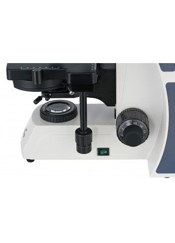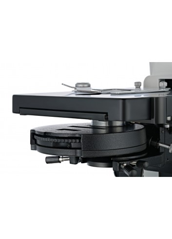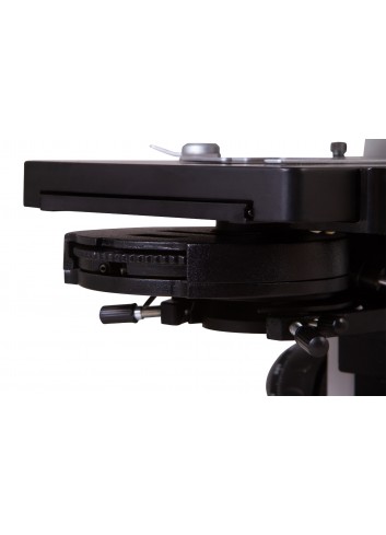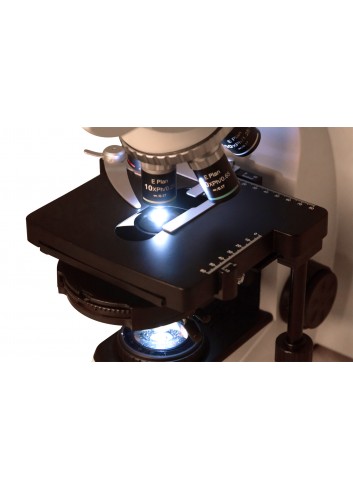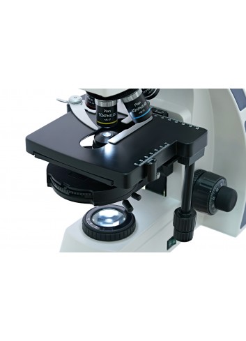 Puede ajustar la nitidez girando los mandos de enfoque aproximado y enfoque preciso. La platina mecánica de doble capa está equipada con un micrómetro mecánico. La platina se puede mover en dos direcciones. El condensador de contraste de fase se encuentra debajo de la platina. La iluminación se realiza mediante una lámpara LED de 5 vatios cuyo brillo es ajustable. Puede configurar la iluminación Köhler.
