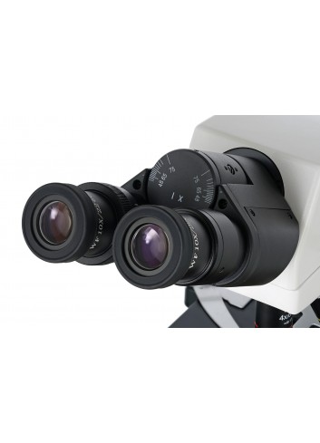 El microscopio está equipado con un cabezal binocular clásico inclinado a 30°. Le permite hacer observaciones con ambos ojos a la vez y evita tensiones en los músculos del cuello durante los periodos de trabajo prolongados. El cabezal se puede girar 360°, lo cual es práctico en el trabajo en grupo, pues una muestra se puede estudiar cómodamente desde cualquier posición. Los oculares incluidos en el kit tienen una ampliación de 10x, aseguran una visión clara y permiten el ajuste de dioptrías.