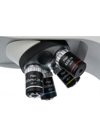 El revólver giratorio admite hasta cinco objetivos, pero el kit solo incluye cuatro objetivos de diversos aumentos. Estos objetivos acromáticos planos de contraste de fase aplanan el campo de visión, mejoran la reproducción del color y reducen la distorsión óptica. Los dos objetivos de mayor aumento están equipados con un borde retráctil para proteger la óptica frente a daños incidentales. El objetivo de 100x permite realizar observaciones por inmersión en aceite.