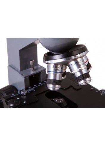 El microscopio cuenta con lentes acromáticas que proporcionan una imagen contrastada, nítida y detallada sin aberraciones ópticas. Los oculares incluidos con el microscopio proporcionan un campo de visión plano y amplio que permite observar objetos extensos de estructura complicada. El cabezal del microscopio monocular se puede girar 360°. El rango de ampliación es de 40–1600x. En el kit se incluye una botella con aceite de inmersión, para ser utilizado con el objetivo de 100 aumentos.