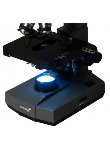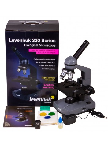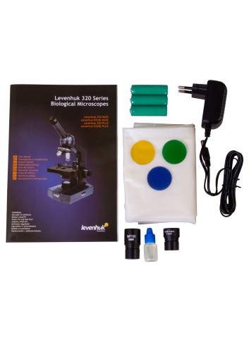 Las muestras se iluminan mediante iluminación LED inferior cuyo brillo es ajustable. El haz óptico pasa a través de un condensador Abbe. El diafragma iris del condensador permite ajustar el brillo. El kit incluye filtros de luz que mejoran el contraste y la nitidez de la imagen observada. La iluminación se alimenta mediante un suministro de corriente alterna y con pilas recargables (incluidas en el kit). Una carga de las pilas proporciona 10 horas de trabajo continuo. Por ello puede utilizar el microscopio Levenhuk 320 PLUS fuera de casa, en expediciones y seminarios.