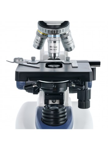Debajo del revólver giratorio del microscopio, existe una platina provista de un micrómetro mecánico. Debajo de la platina hay un condensador Abbe con un diafragma iris y un soporte para filtros. Debajo, hay un sistema de iluminación que consiste en una lámpara LED y una lente colectora. La iluminación funciona con una fuente de alimentación CA y su brillo es ajustable.