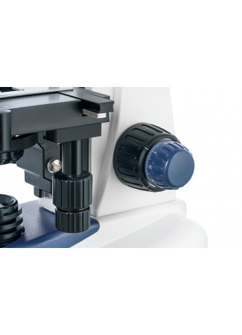 El cabezal se puede girar 360°. En el cabezal, hay botones de control para operar la cámara digital, ranuras para conectar dispositivos externos y una ranura para tarjeta de memoria. Los objetivos ya están instalados en el revólver giratorio. Son objetivos acromáticos con un aumento de 4x, 10x, 40x y 100x. Los objetivos de 40x y 100x tienen un mecanismo de retracción por muelle que protege la lente frontal contra daños accidentales. El objetivo de 100x se utiliza para la inmersión en aceite.