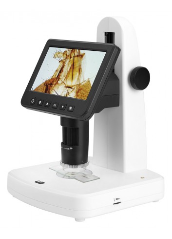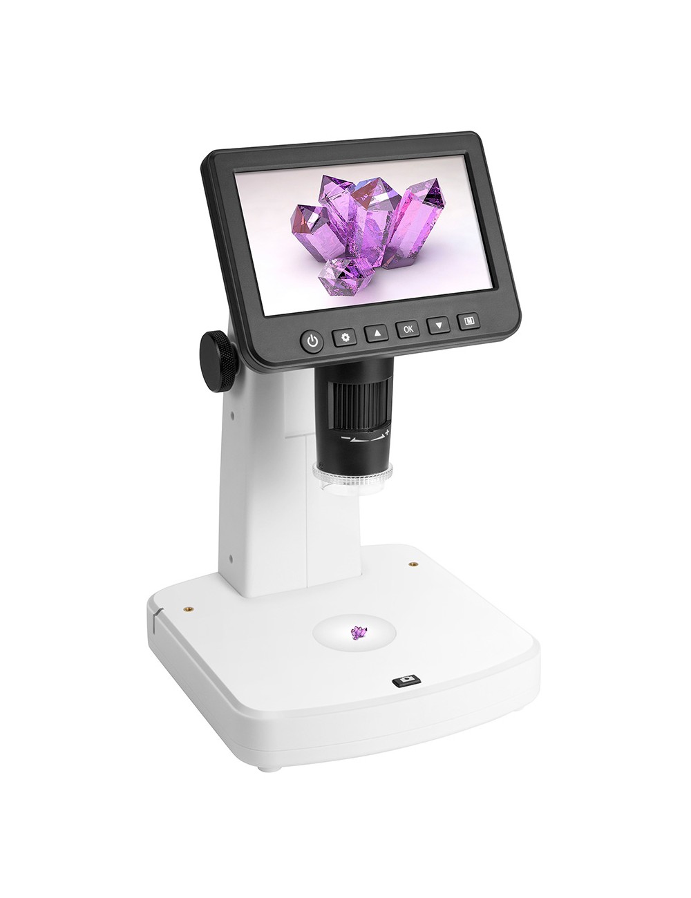 Las imágenes son capturadas por una cámara digital de 5M. La cámara proporciona una ampliación de 10–300x, y un zoom adicional permite observar objetos con una ampliación de hasta 1200x. La imagen obtenida, vistosa y detallada, se transmite a una pantalla LCD incorporada. Además, la cámara incorporada permite tomar fotos y grabar vídeos. Los botones de control se encuentran justo debajo de la pantalla. Se utilizan para configurar la calidad de las fotos y del video, activar y desactivar la toma de fotos a intervalos de tiempo (time-lapse), elegir el modo de video circular y establecer la fecha y la hora.