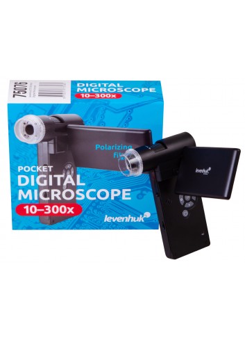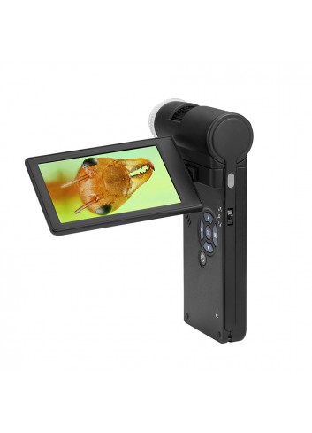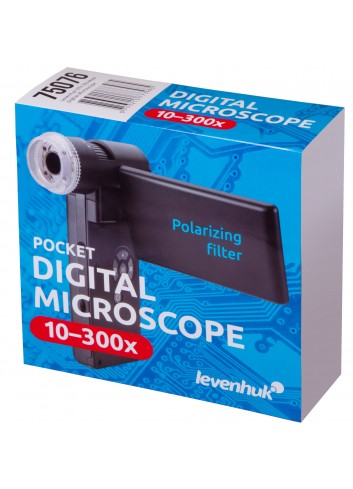 El microscopio permite trabajar solo con objetos no transparentes. Como fuente de luz se utiliza una iluminación por LED de brillo ajustable. El filtro polarizador proporcionado permite reducir los reflejos parásitos durante la observación de objetos brillantes. La ampliación es variable dentro de un rango de 10x a 300x. Además, un zoom digital permite observar con una ampliación de hasta 1200x. El microscopio funciona con una fuente de alimentación CA o una pila, que permite trabajar de forma continuada durante 2 horas y media.