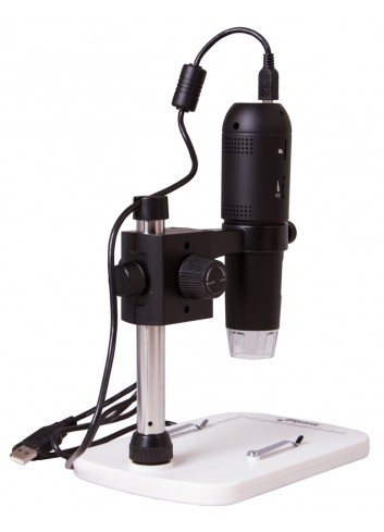 El microscopio se entrega con un práctico soporte; cuando el microscopio está bien sujeto se obtienen imágenes más precisas. En la parte inferior del soporte hay una platina con pinzas metálicas y un micrómetro.