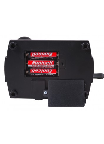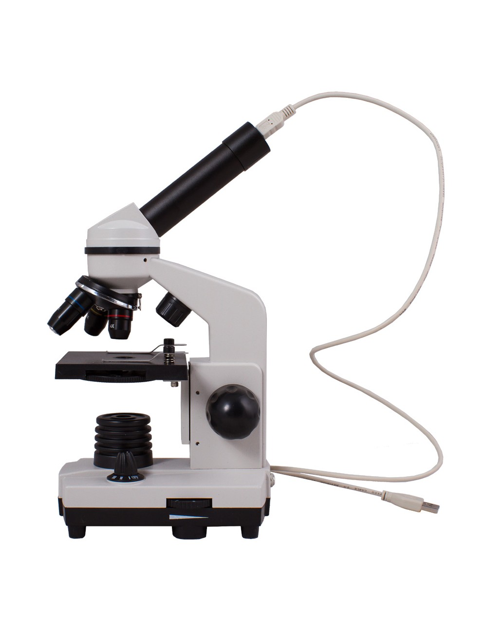 El cuerpo del microscopio está fabricado con plástico de calidad, mucho más ligero que el metal pero aún fiable, lo que permite usarlo con frecuencia. Su cabezal monocular, inclinado a 45 grados, le permite adoptar una posición cómoda mientras observa las muestras. La iluminación puede, o bien enchufarse a una toma eléctrica, o también puede funcionar con pilas. La cámara digital se alimenta eléctricamente conectándola al ordenador con un cable USB.
