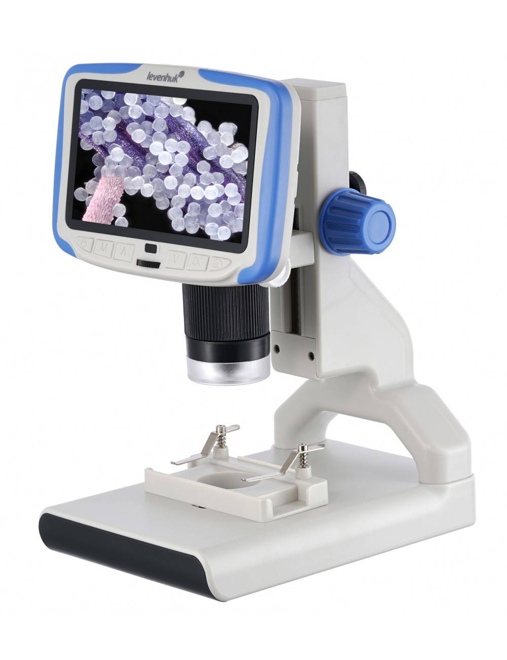 El microscopio digital Levenhuk Rainbow DM500 LCD es un dispositivo para estudiar objetos de cualquier grado de transparencia. Es adecuado para estudiar partes de plantas, insectos y muestras para microscopio listas para usar. Puede examinar piedras, monedas, componentes electrónicos y mecanismos. Este microscopio también le permite tomar fotos y grabar vídeos. Puede controlar esas funciones mediante un mando a distancia inalámbrico.