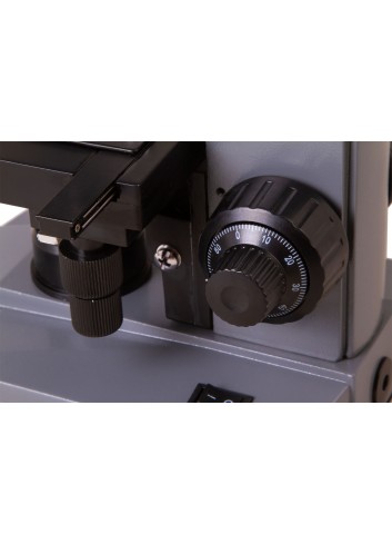La platina está equipada con un micrómetro mecánico, que permite posicionar las muestras de forma rápida y precisa bajo el objetivo. El ajuste de la nitidez se realiza de la mejor manera posible mediante controles de ajuste aproximado y ajuste fino. Debajo de la platina hay un condensador Abbe con un diafragma iris. Debajo de la platina se encuentra el sistema de iluminación LED, cuyo brillo es ajustable. La iluminación se alimenta mediante corriente alterna o con pilas recargables (incluidas en el kit). Una carga de las pilas proporciona 10 horas de trabajo continuo.