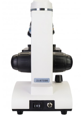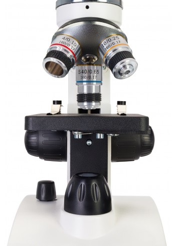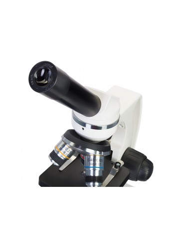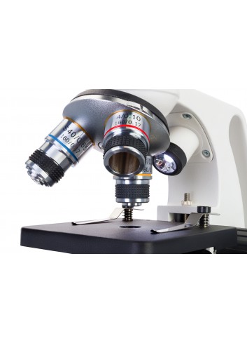 La óptica acromática proporciona imágenes claras y detalladas de las muestras observadas. El cabezal giratorio del instrumento tiene instalados tres objetivos: 4x, 10x y 40x (con mecanismo de resorte). El ocular de campo amplio proporciona una visión clara con una ampliación de 10x. El cabezal monocular está inclinado 45° de forma ergonómica, lo que hace que las observaciones prolongadas sean más cómodas. Además, el cabezal puede girar 360 grados en el plano horizontal, lo que es ideal para experimentos en grupo. No es necesario mover el microscopio cuando una muestra debe ser observada por varias personas, pues el cabezal se puede girar según convenga. El microscopio viene equipado con perillas separadas de enfoque preciso y enfoque aproximado, lo que favorece un ajuste más fluido de la nitidez.