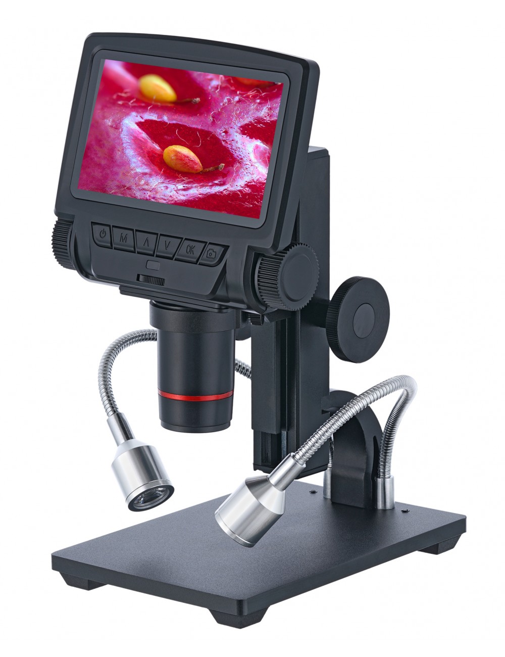 El microscopio proporciona una ampliación digital de 5 a 260 aumentos. La ampliación óptica varía desde 5 a 15 aumentos. La imagen transmitida por el objetivo se muestra en una pantalla LCD a color integrada de 5 pulgadas. La imagen es clara, de alto contraste y detallada. Se utilizan puertos HDMI y AV para la conexión con pantallas externas.
