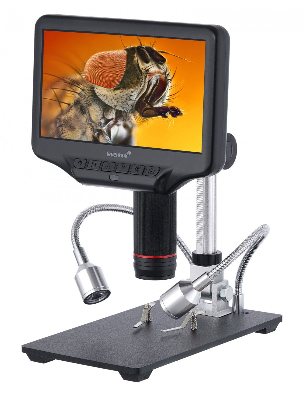 La iluminación consta de dos focos LED con brillo ajustable. Los focos están montados en soportes flexibles, que permiten dirigir la luz hacia el objeto con la mayor precisión posible. Los focos se controlan (ajuste del brillo, encendido y apagado) mediante un pequeño interruptor situado en el cable de alimentación.