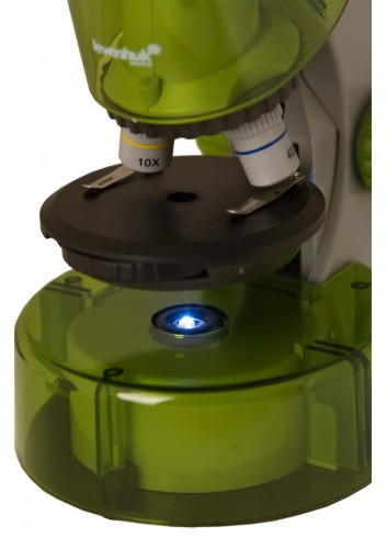 Este microscopio permite observar muestras transparentes (una gota de agua de acuario, láminas finas de plantas o portaobjetos con muestras ya preparadas). Los objetos se colocan en la práctica platina redonda y se sujetan con dos pinzas, de forma que las muestras estudiadas se mantengan siempre en su sitio. La luz emitida por los diodos LED (situados bajo la platina) atraviesa la muestra, produciendo en el ocular la imagen aumentada. Puede ajustarse la intensidad de la iluminación.