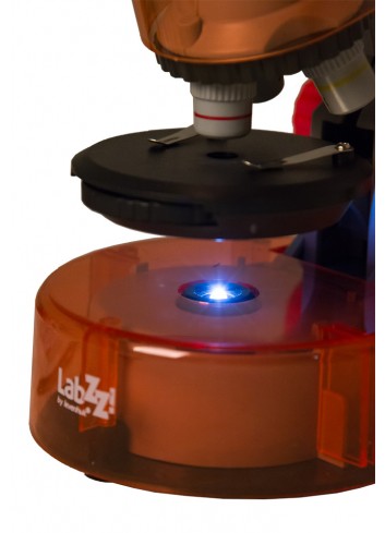 Este microscopio permite observar muestras transparentes (una gota de agua de acuario, láminas finas de plantas o portaobjetos con muestras ya preparadas). Los objetos se colocan en la práctica platina redonda y se sujetan con dos pinzas, de forma que las muestras estudiadas se mantengan siempre en su sitio. La luz emitida por los diodos LED (situados bajo la platina) atraviesa la muestra, produciendo en el ocular la imagen aumentada. Puede ajustarse la intensidad de la iluminación.