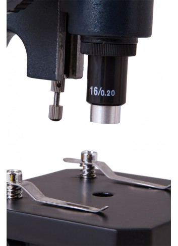 Este microscopio monocular tiene una sola lente de objetivo acromática de 16x que ofrece una vista clara sin aberraciones cromáticas o esféricas. El cabezal de este modelo está justo sobre la platina, pero para que las observaciones sean más cómodas se puede inclinar tanto el cabezal como la platina en el ángulo deseado con el brazo del microscopio.