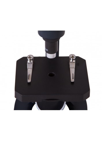 La platina de 100x90 mm es perfecta para las observaciones de uno o dos especimenes. Para preparar la muestra, sitúala en un portaobjetos vacío y cúbrela cuidadosamente. La preparación resultante se instala sobre la platina y se fija con los clips. Con el mando de enfoque grueso puedes enfocar la vista desplazando arriba y abajo el tubo del microscopio (en intervalos de 20 mm).