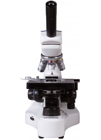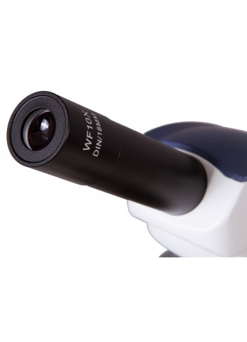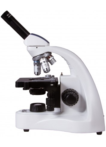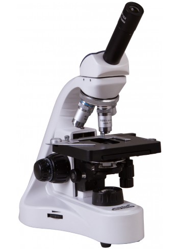 El microscopio tiene un cabezal monocular con un práctico ángulo de inclinación de 45°, que permite realizar observaciones prolongadas con comodidad. El cabezal se puede girar 360°, lo que permite usar este microscopio en grupos de trabajo. El sistema óptico utiliza elementos acromáticos con revestimiento antifúngico. Las lentes objetivo y el ocular están provistos de un revestimiento protector. El revólver giratorio contiene cuatro lentes objetivo, dos de ellas son retráctiles. Se puede utilizar la lente objetivo de 100x para realizar observaciones por inmersión en aceite (se incluye un tubo de aceite de inmersión en el kit). El ocular proporciona un campo de visión amplio y cuenta con ajuste de dioptrías.