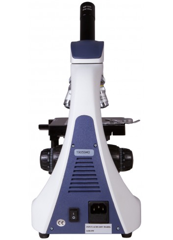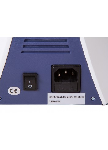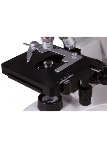 Existen mandos de ajuste aproximado y preciso de la nitidez. La platina mecánica del microscopio se puede mover a lo largo de dos ejes y está equipada con un micrómetro mecánico. Debajo de la platina hay un condensador Abbe con un diafragma iris y un soporte para filtros. La iluminación se realiza mediante una lámpara LED brillante de 5 vatios. Está situada en la parte inferior del microscopio. La iluminación se alimenta con una fuente de alimentación CA o pilas. El sistema de iluminación también permite el ajuste del brillo.