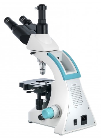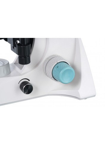 La platina del microscopio está equipada con un micrómetro mecánico. Debajo de la platina hay un condensador Abbe con un diafragma iris y un soporte para filtros. La potente iluminación LED se complementa con una lente colectora; el brillo de la iluminación es ajustable. Se utiliza alimentación eléctrica como fuente de alimentación.