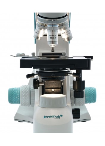 El cabezal del microscopio consta de un componente binocular para observaciones visuales y un tubo vertical para instalar un ocular de vídeo. Esto le permite simultáneamente estudiar la muestra y grabar las observaciones en la cámara (esta se compra por separado). El cabezal se puede girar 360°, lo cual es práctico para el trabajo en grupo. La óptica acromática de campo amplio proporciona un aumento de 40x a 1000x. El kit incluye oculares de 10x y objetivos de 4x, 10x, 40x y 100x. Los objetivos de 40x y 100x están equipados con un mecanismo de retracción por muelle. Se dispone de ajuste aproximado y ajuste preciso del enfoque.
