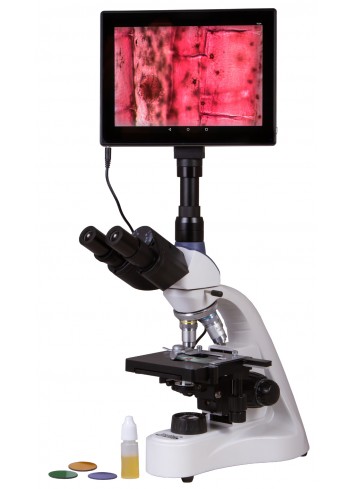 El microscopio digital para microbiología Levenhuk MED D20T LCD es un instrumento óptico profesional para hacer observaciones de campo claro. Su característica principal es una cámara digital de 5 MP con una pantalla LCD que puede transmitir en tiempo real una imagen procedente del objetivo del microscopio, y permite grabar videos y tomar fotografías con fines de investigación. Además, el microscopio cuenta con una óptica acromática semi-plana y permite configurar la iluminación Köhler. Este microscopio es útil en una amplia gama de tareas dentro del campo de la microbiología, medicina e investigación.