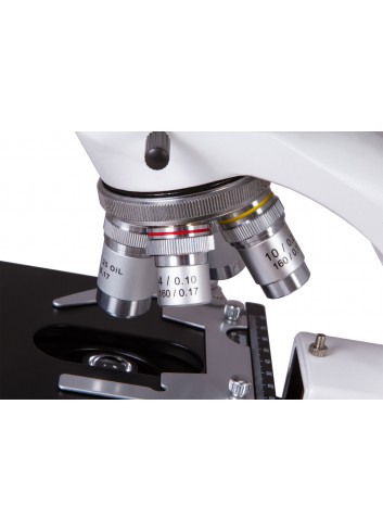 Las lentes objetivo acromáticas permiten la observación detallada de objetos microscópicos con una ampliación de 40x a 1000x. La lente objetivo de 100x se utiliza para realizar observaciones por inmersión en aceite (se incluye un tubo de aceite de inmersión en el kit). Además, los objetivos de mayor aumento son retráctiles para proteger la óptica frente a daños accidentales. Los oculares proporcionan un aumento de 10x y un amplio campo de visión que permite trabajar con muestras extensas. Todos los elementos ópticos están protegidos con un revestimiento antifúngico.