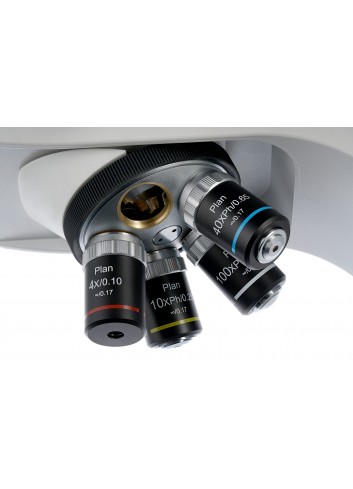 Los accesorios ópticos incluyen objetivos acromáticos planos de contraste de fase de diversos aumentos y oculares de campo amplio de 10x con ajuste de dioptrías. Los objetivos de 40x y 100x están equipados con un borde retráctil para proteger la óptica frente a daños accidentales. El sistema óptico produce imágenes claras y de alto contraste sin aberraciones cromáticas. El objetivo de 100x permite realizar observaciones por inmersión en aceite. Todos los accesorios están hechos de vidrio óptico con revestimiento antifúngico.
