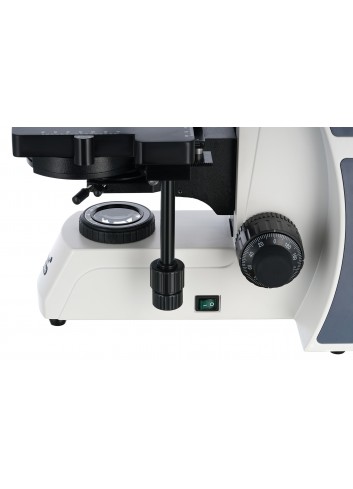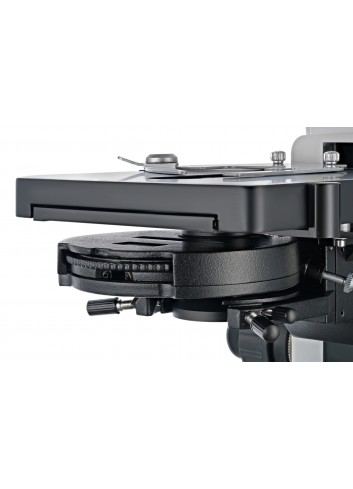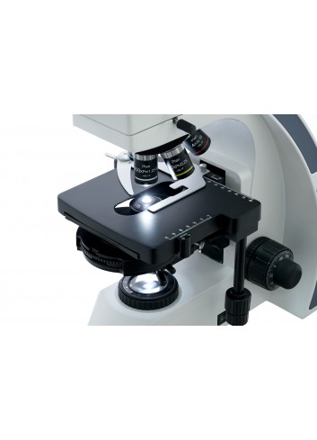 La platina se puede mover a lo largo de dos ejes y tiene un micrómetro mecánico para ayudar a disponer las muestras bajo el objetivo de forma rápida y precisa. Se puede realizar un enfoque aproximado y un enfoque preciso. Posibilidad de utilizar la iluminación Köhler. En la parte inferior hay una lámpara LED de brillo ajustable. El condensador de contraste de fase se puede utilizar para observaciones de campo oscuro mediante el método «seco».