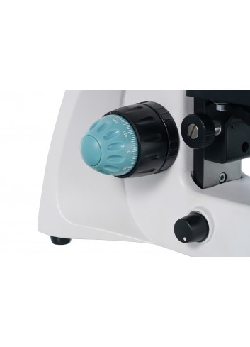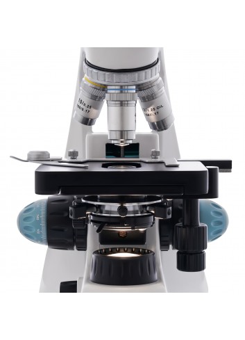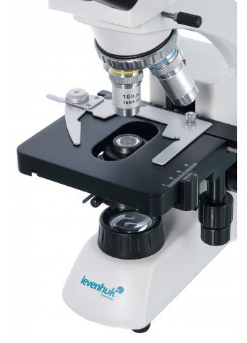 La platina cuenta con un micrómetro mecánico, que le ayuda a colocar de forma rápida y precisa la muestra observada debajo del objetivo. Debajo de la platina, hay un condensador Abbe de campo claro de altura ajustable. Hay un diafragma iris y un soporte para filtros. El sistema de iluminación consiste en una bombilla halógena con una lente colectora. La potente bombilla proporciona una iluminación uniforme y brillante del área de trabajo. El brillo de la iluminación es ajustable. Se utiliza alimentación eléctrica como fuente de alimentación.