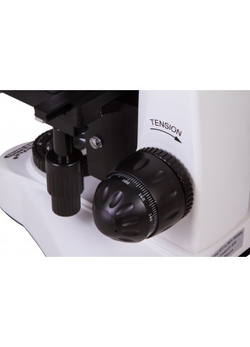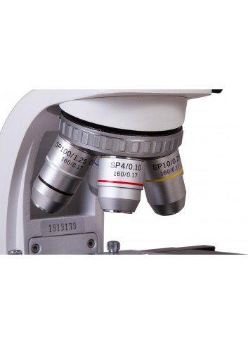 Los oculares y los objetivos están hechos de vidrio óptico y tienen un revestimiento antifúngico. El revólver giratorio contiene cuatro objetivos, lo que permite ajustar rápidamente el grado de aumento general del microscopio. Los dos objetivos de mayor aumento tienen una carcasa retráctil protectora. El objetivo de 100x se puede utilizar para realizar observaciones por inmersión en aceite (se incluye un tubo de aceite de inmersión en el kit). Los oculares son de campo amplio y tienen ajuste de dioptrías, lo que permite adaptar con precisión la óptica del microscopio a la vista del usuario. Los mandos de enfoque aproximado y enfoque preciso tienen un factor de avance pequeño para ajustar la nitidez de la imagen.